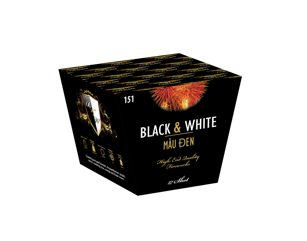 Màu Den fra serien Black & White er et 26 mm øredøvende salutbatteri med 25 skud og 422 g krudt. Et råt og kraftfuldt batteri til drengerøvene, der vil mærke nytårsaften helt ind i kroppen.
