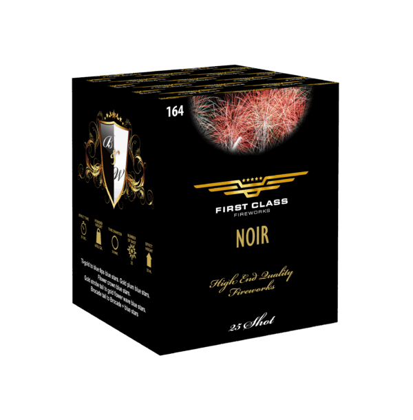 Noir fra serien Black & White er et 30 mm batteri med 25 skud og 500 g krudt. Et kraftfuldt og elegant batteri, der leverer et eksklusivt show til nytårsaften med intense lys og storslåede effekter.