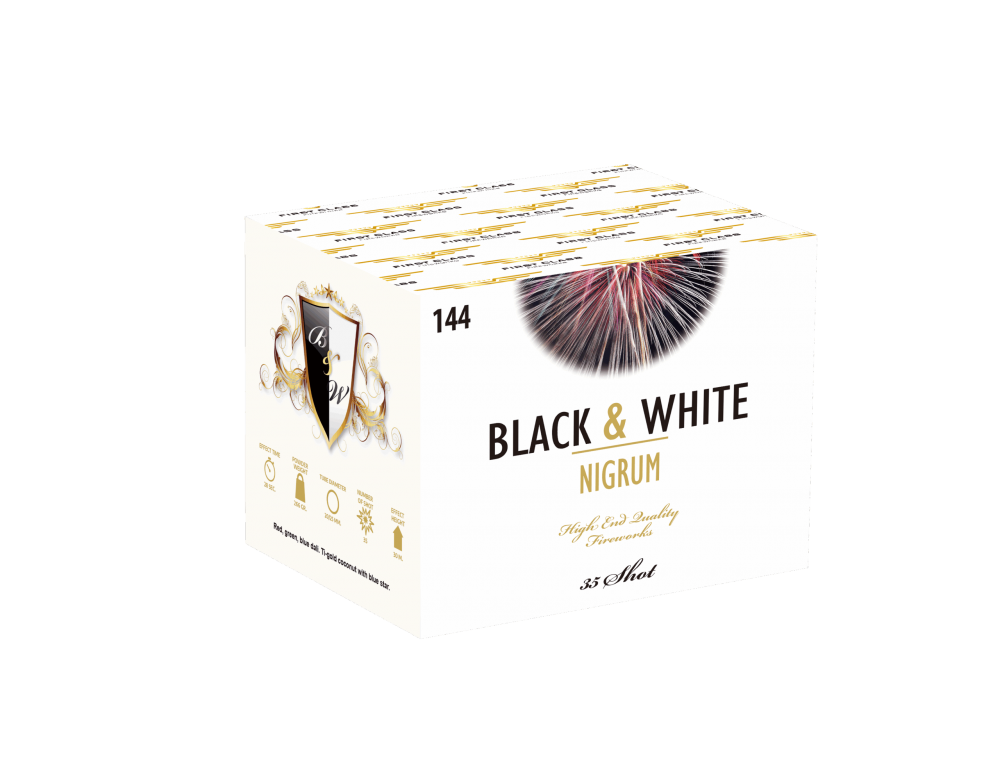 Nigrum fra serien Black & White er et 20–25 mm batteri med 35 skud og 275 g krudt, der leverer en imponerende mix af effekter i høj kvalitet. Perfekt til et spektakulært og elegant fyrværkerishow.