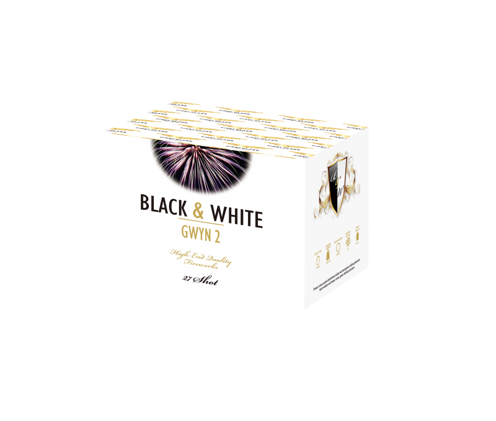 Gwyn 2 fra serien Black & White er et 30 mm batteri med 27 skud og 491 g krudt. Et eksklusivt og kraftfuldt batteri, der leverer et imponerende og stilrent show til nytårsaften.